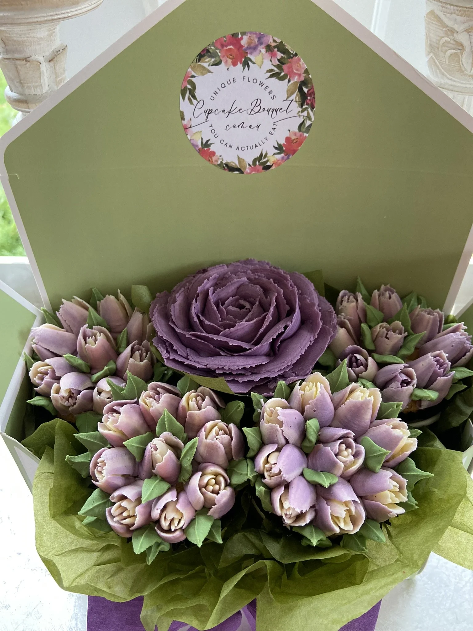 This unique box consists of 5 (Jumbo) Cupcakes topped with lovely buttercream flowers. Each box consists of a large rose surrounded by tulips or you might prefer to have a box only of tulips, the choice is yours. Just pick an accent colour and leave the rest to us… 😊